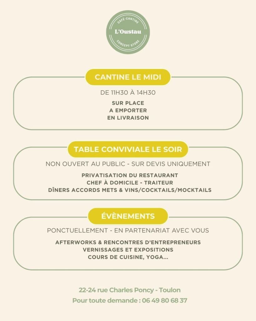 L’Oustau est un lieu hybride qui abrite 3 activités : de la restauration, des évènements et un coin boutique. C’est un lieu unique dans le centre ville de Toulon, propice aux découvertes et aux rencontres !